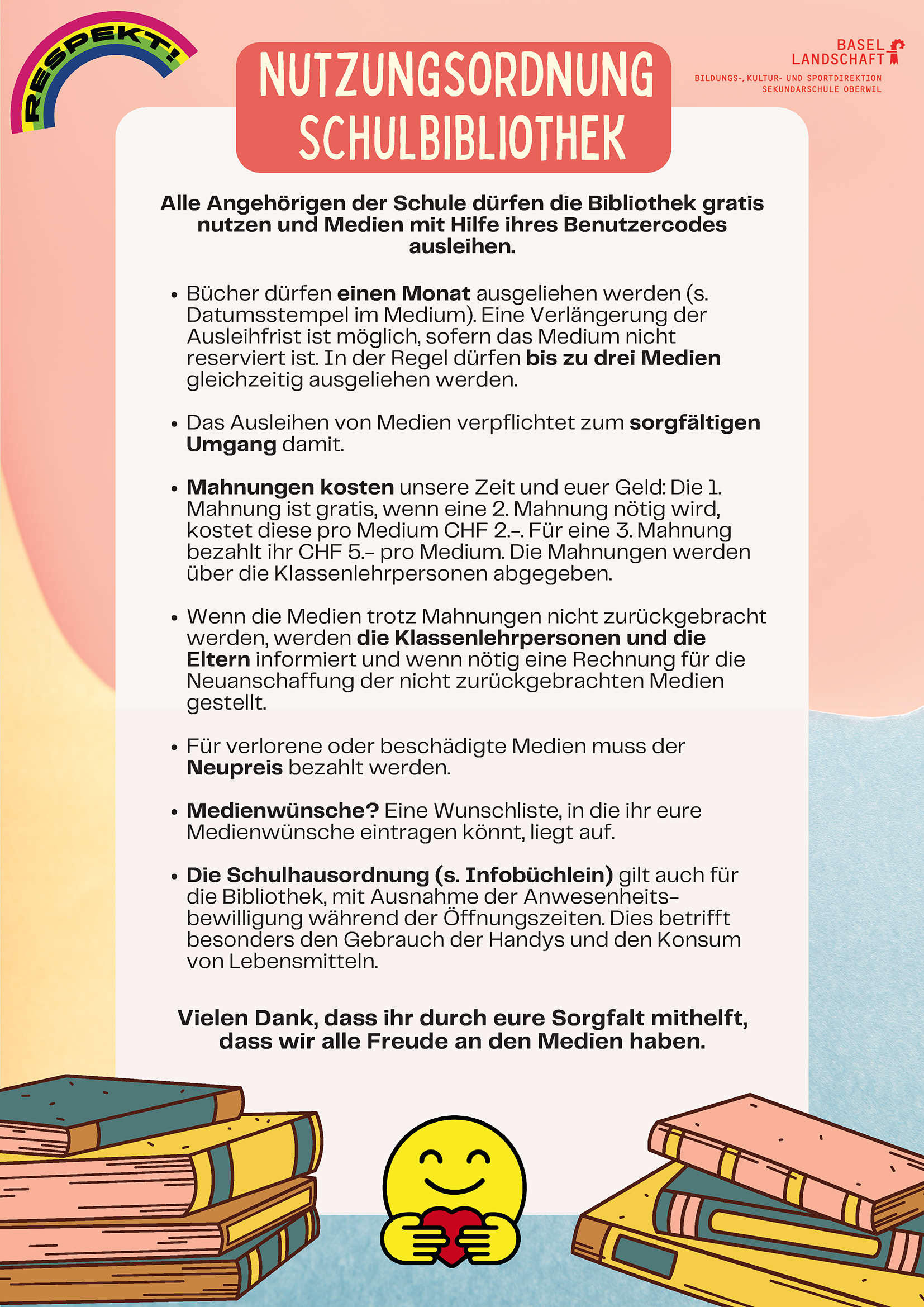“Das Schicksal ist ein mieser Verräter”, “Der Club der roten Bänder” oder diverse Abenteuer von Spiderman? Diese und viele andere Geschichten zwischen Fantasywelten und dem echten Leben findest du in der Schulbibliothek, als Romane, Comics, DVDs oder Hörbücher. Zudem können dich unsere Sachbücher über verschiedenste Themen bei deiner Projektarbeit oder einem Vortrag unterstützen, und verregnete Pausen kannst du mit deinen Freunden an einer der Tischgruppen in der Bibliothek bei lustigen Spielen wie Ligretto oder Black Stories verbringen.